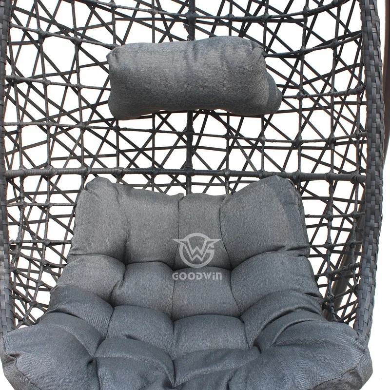 GW3335,Introducing a unique design for gardens and patios of any size, this handwoven rattan hanging basket is crafted from durable PE rattan and comes with a comfortable cushion for added relaxation.
