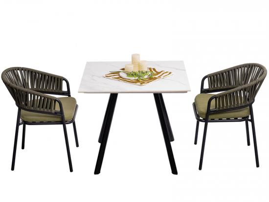 Enhance your outdoor space with our Simple Light Luxury Square aluminum frame Creative Design Rock Board Tables paired with the aluminum Frame Hand-Woven Rope Patio Chair. Transform your patio or deck with this modern rope chair, featuring a powder-coated aluminum frame and intricately woven rope seat and backrest for a chic, contemporary aesthetic. This combination exudes style and sophistication while providing a relaxing outdoor seating experience.
