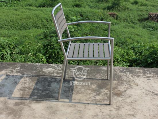 An elegant stainless steel frame plastic wood armchair for outdoor use,with a UV-resistant poly-wood seat and back and a durable stainless steel frame.Time to upgrade and refresh your indoor or outdoor living space with this patio dining armchair for Goodwin.It's stack-able for convenience and space.