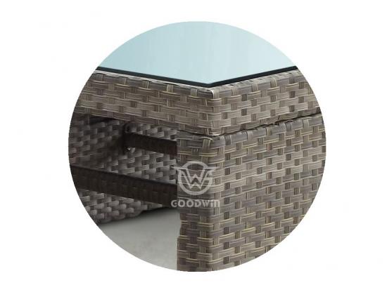 This outdoor knock down design synthetic rattan table is perfect for those patio and terrace areas for great dining. It is made a solid aluminum welded frame and hand woven with the UV-resistant synthetic rattan. The rectangle outdoor dining table comes in flat-pack form of ease of shipping and only requires the legs to be assembled and the glass place on top of the table.